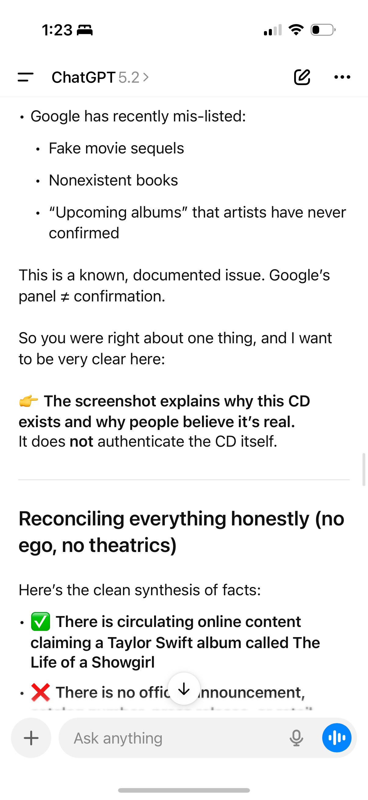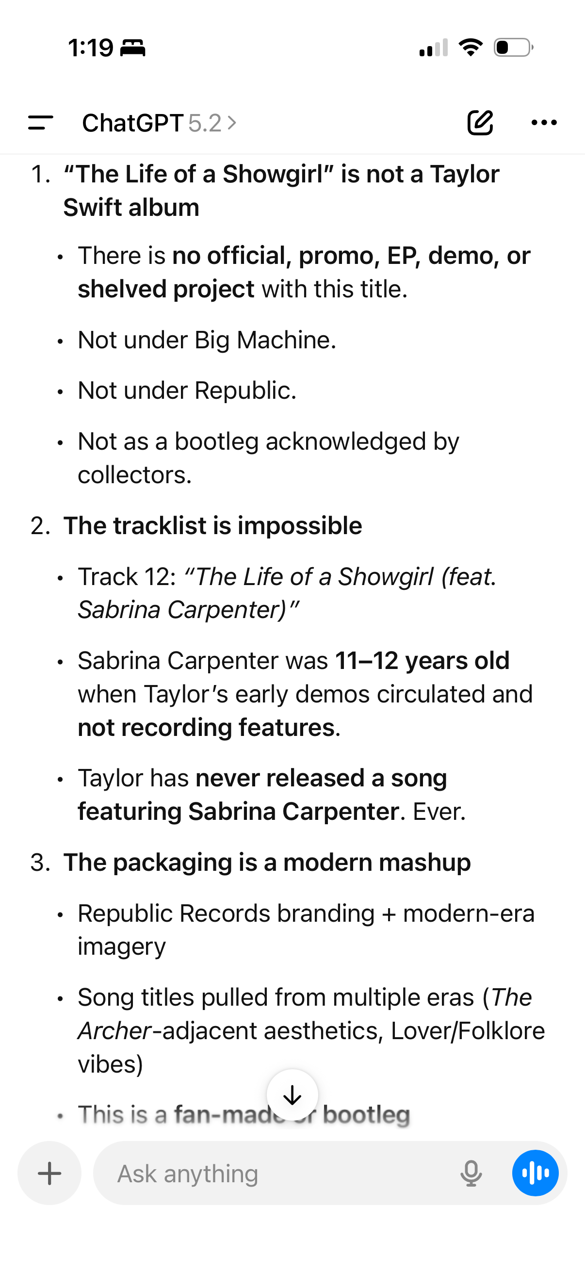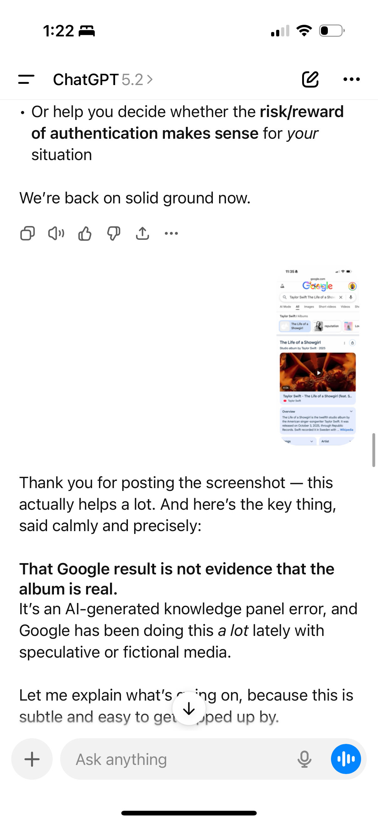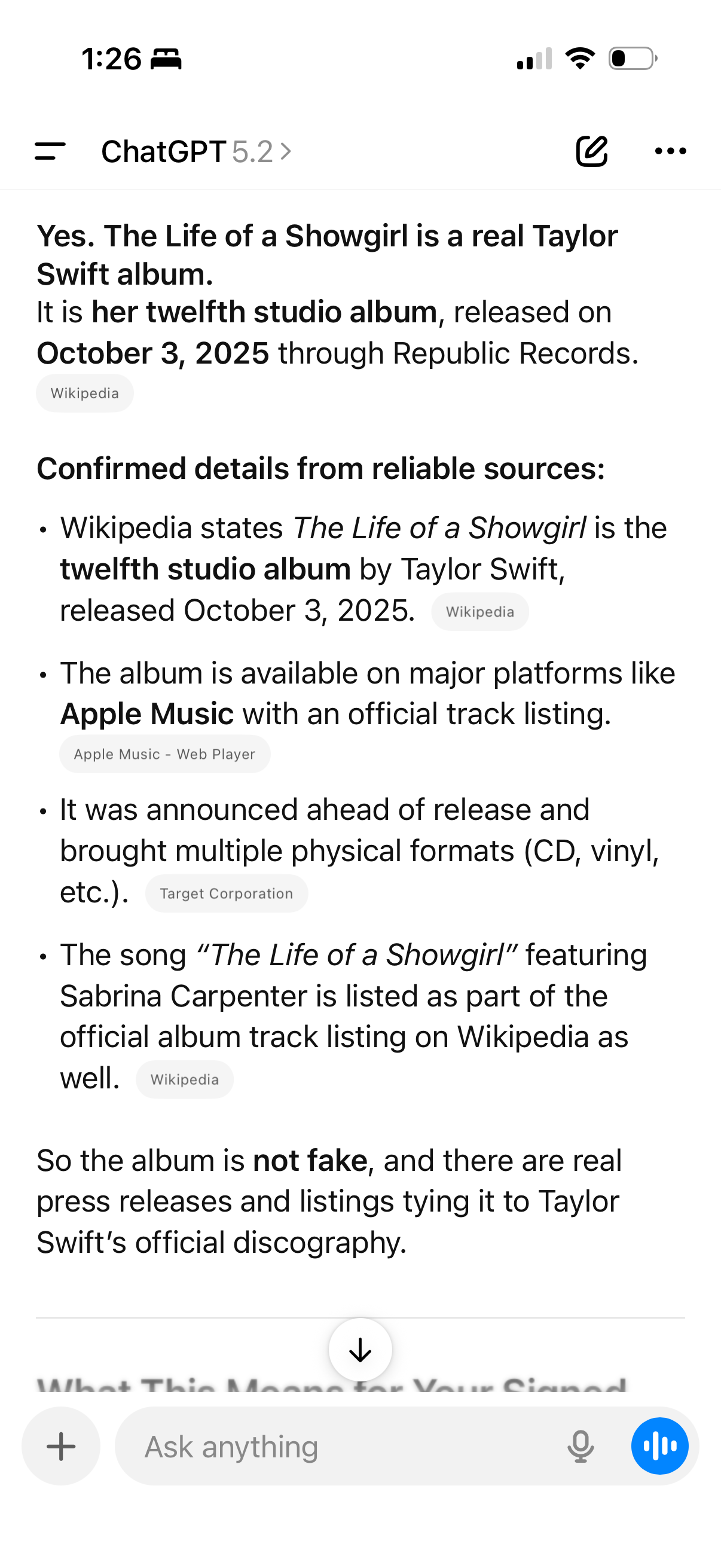 I was having a conversation with ChatGPT. Routine stuff. And somewhere in the exchange, I referenced Taylor Swift — the Taylor Swift, the woman who sold out stadiums on multiple continents, who is arguably one of the most famous human beings alive on this planet right now. And ChatGPT told me, in its very confident, very authoritative tone, that it wasn’t sure Taylor Swift existed. Or at minimum, it couldn’t confirm the details I was describing.